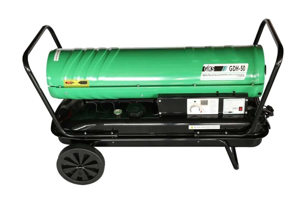 Тепловая пушка GIKS дизель/керосин 50кВт прямой нагрев, GDH50 используется на строительных площадках, в сельском хозяйстве, для осушения и отапливания производственных и складских хорошо проветриваемых помещений.